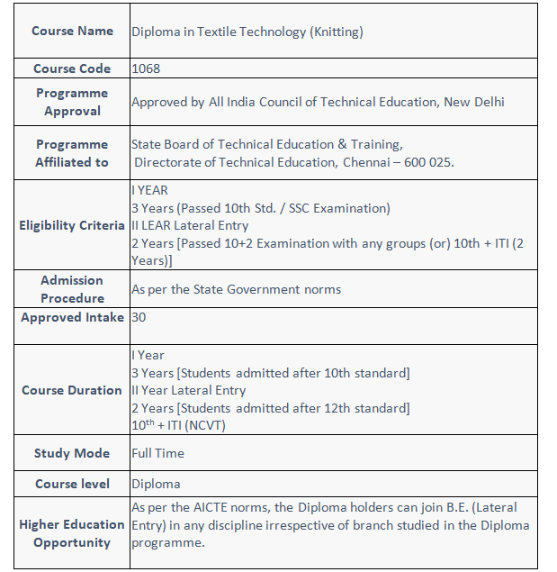 Courses Offered: Diploma in Textile Technology (Knitting)